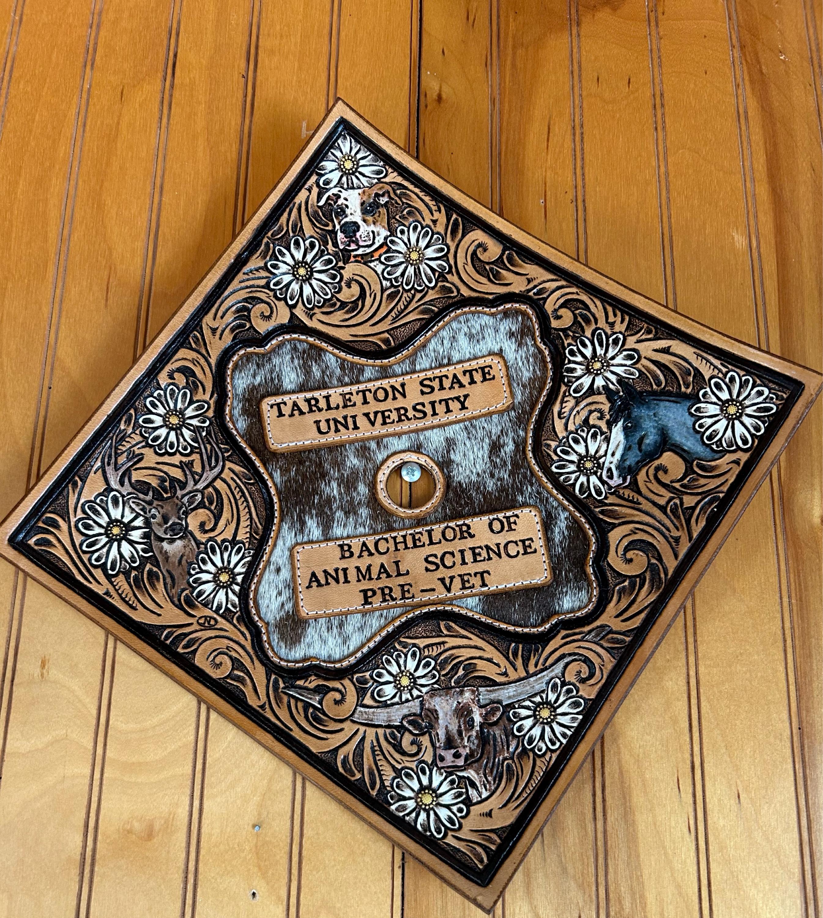 Graduate with a special momento of all your hard work and schooling with a custom tooled leather graduation cap topper. Message me to discuss everything you would like to incorporate on your one of a kind keepsake. Please plan ahead, they take a bit of time and everyone graduates around the same time!