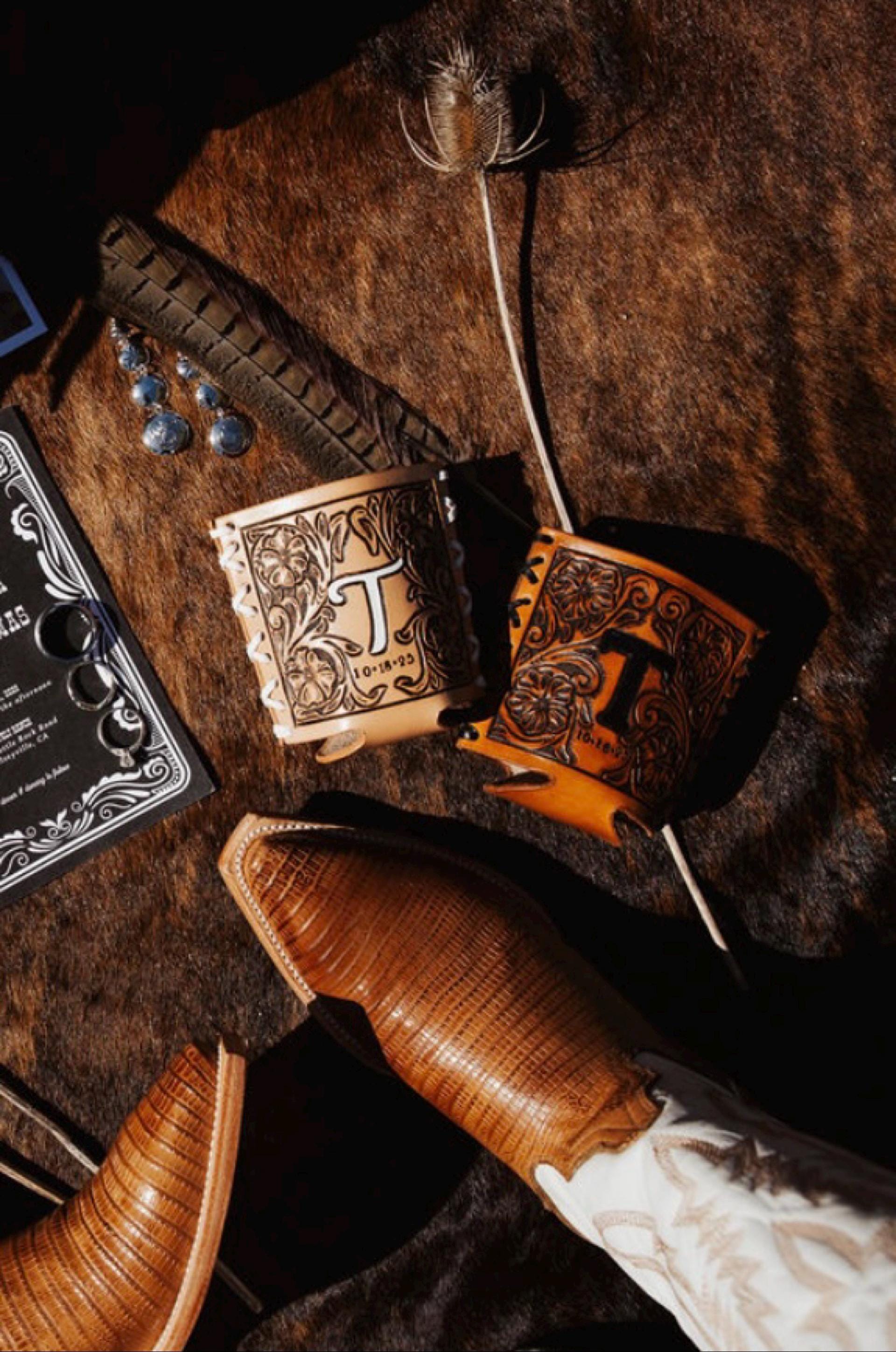 Custom tooled leather beer koozies for that little bit of extra style and function while sipping your favorite beverage. Perfect wedding gift and a fun way to brand your big day as well as a keepsake to last for years to come. Customize it with initials, brand, Mr and Mrs, date etc. also a really fantastic groomsmen gift that they will actually use time and again. Message me to create your design and make something truly special for the big day!