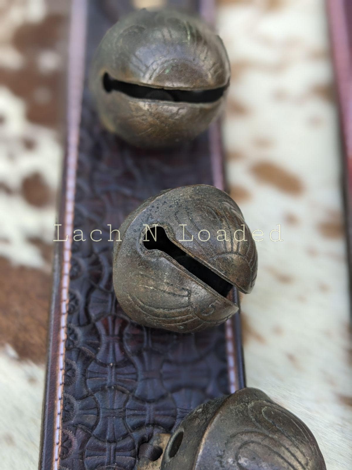 Beautiful antique petal stamped brass sleigh bells revamped onto a handtooled leather door hanger. Each hanger has three antique bells that sound every bit of Christmas spirit. Adorn your most used door to hear the chimes of the season.
