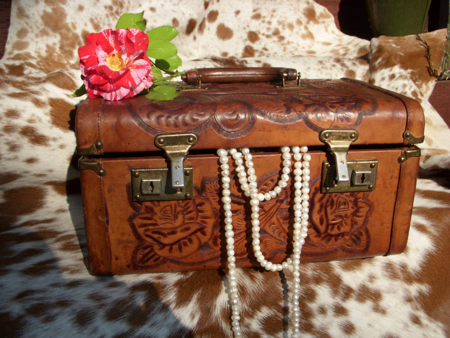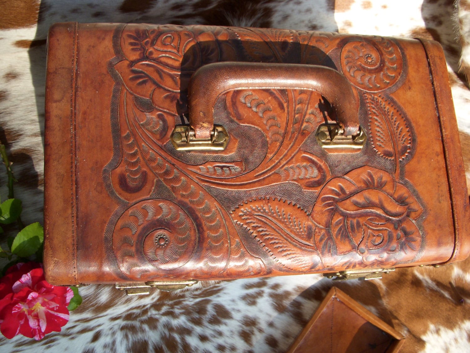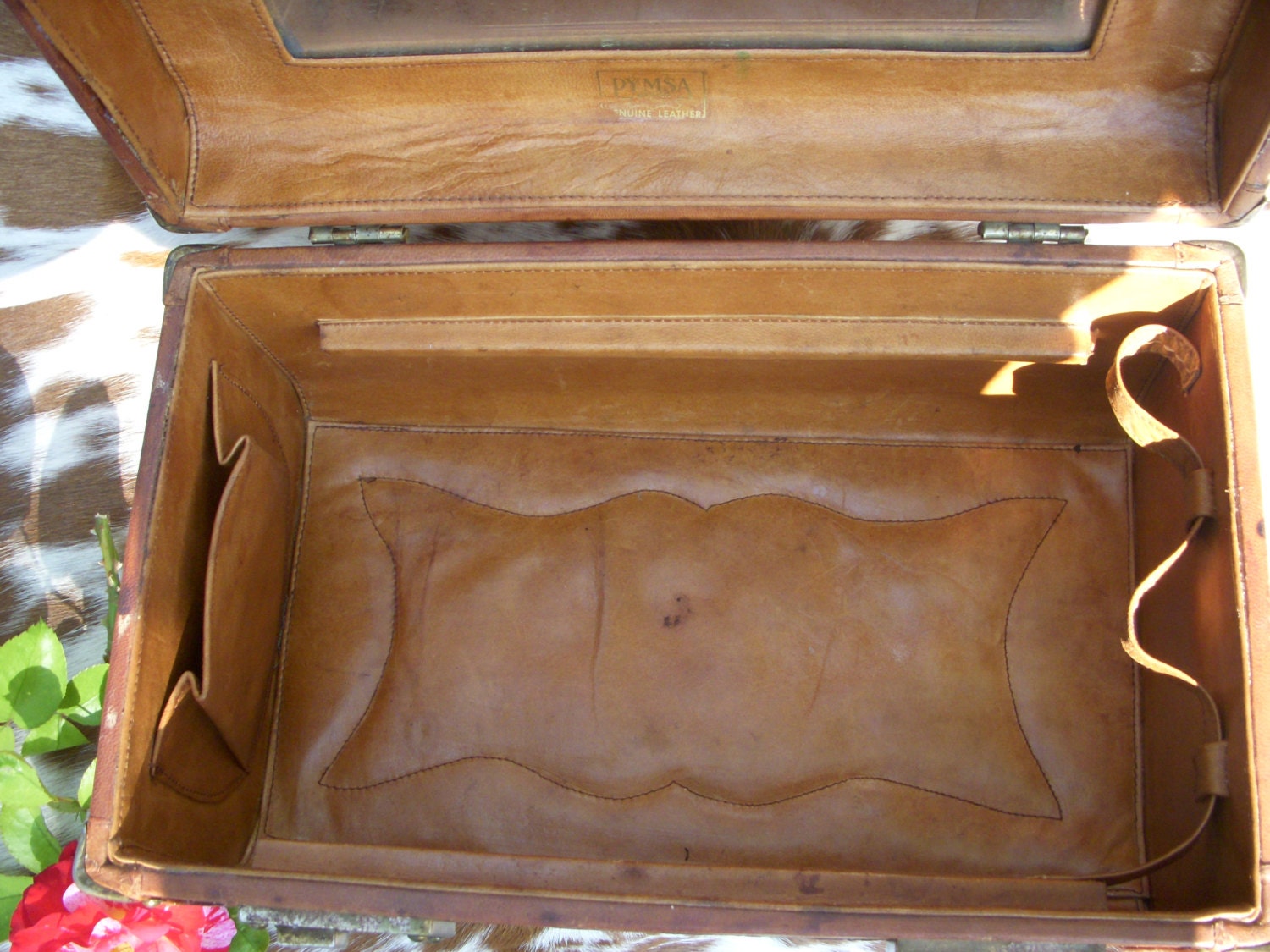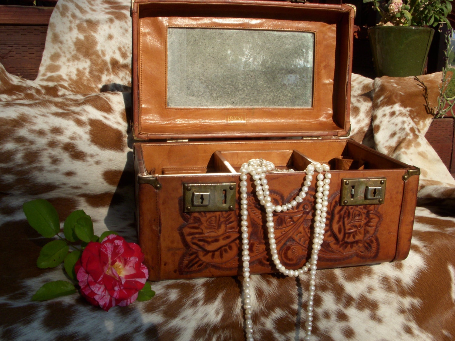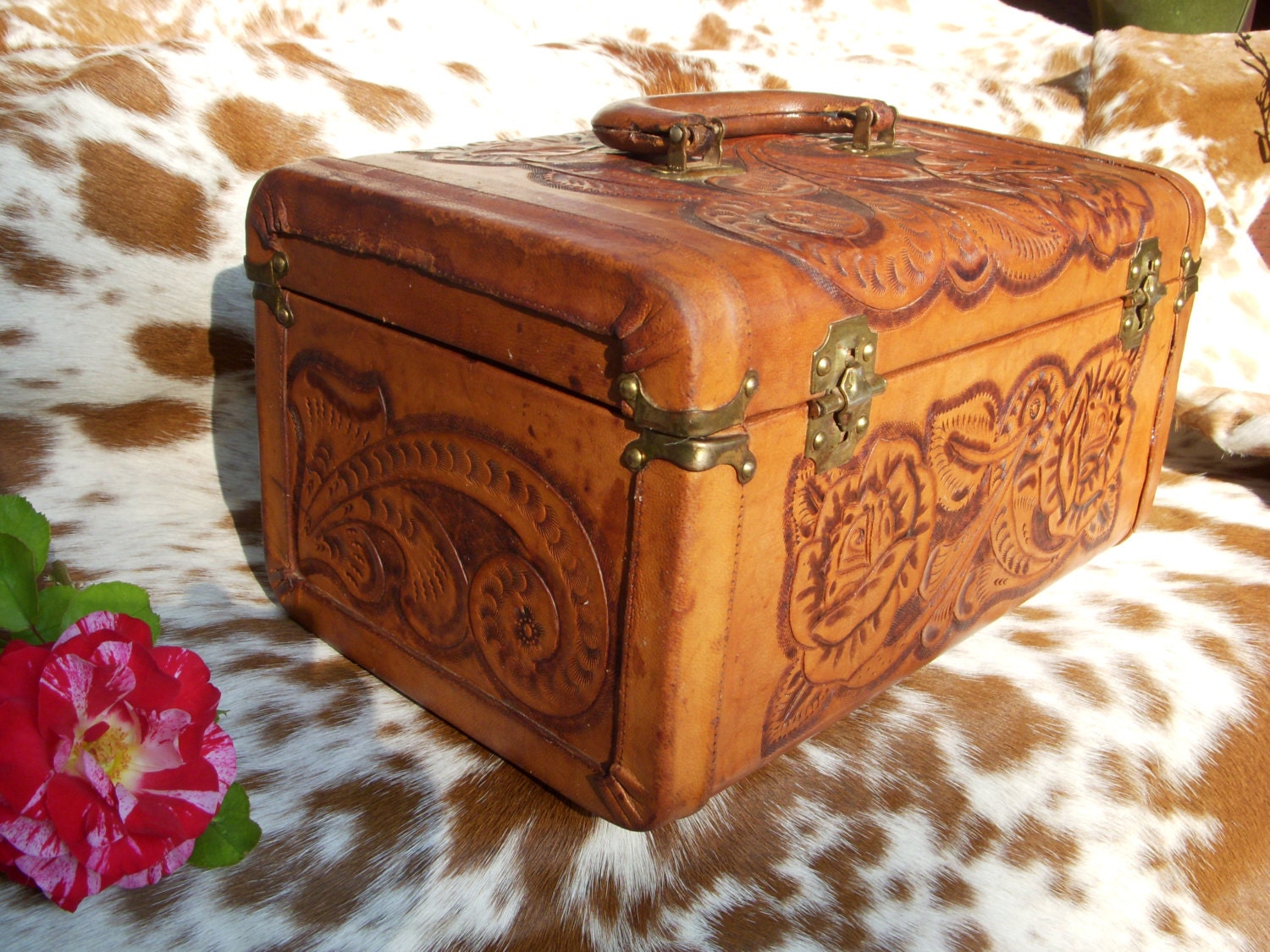 A Beautifully tooled Train case with lovely rose detail. It has a great aged leather patina and everything is original. Case also has working key and locks. There are a few small glue spots on the trey and case that have been repaired where the leather has separated. Handle is in good working order and ready for some travel. Perfect for staging or storing treasured items. Mirror is a bit foggy and not usable for applying makeup. The Pymsa logo is still visible on the case. From Mexico in the 50's. measures 13"L by 7.5"W by 7" T. Message for additional pics or questions!