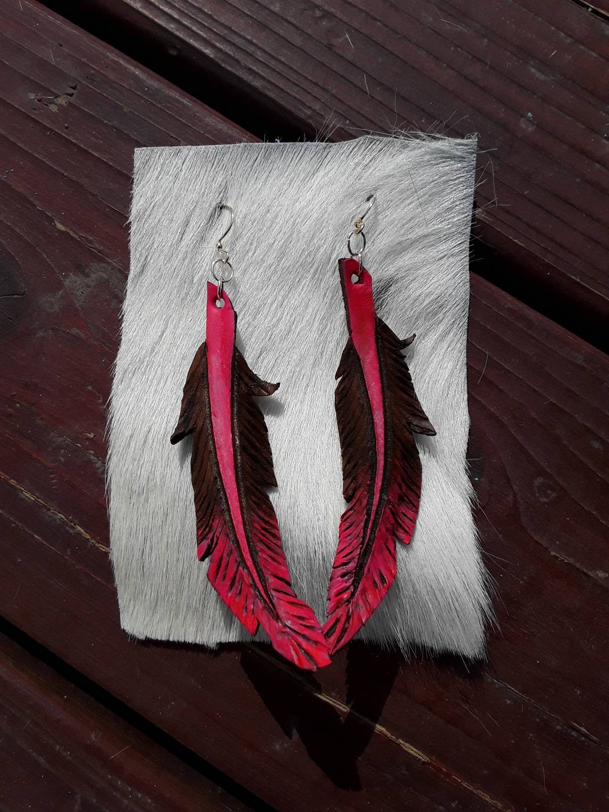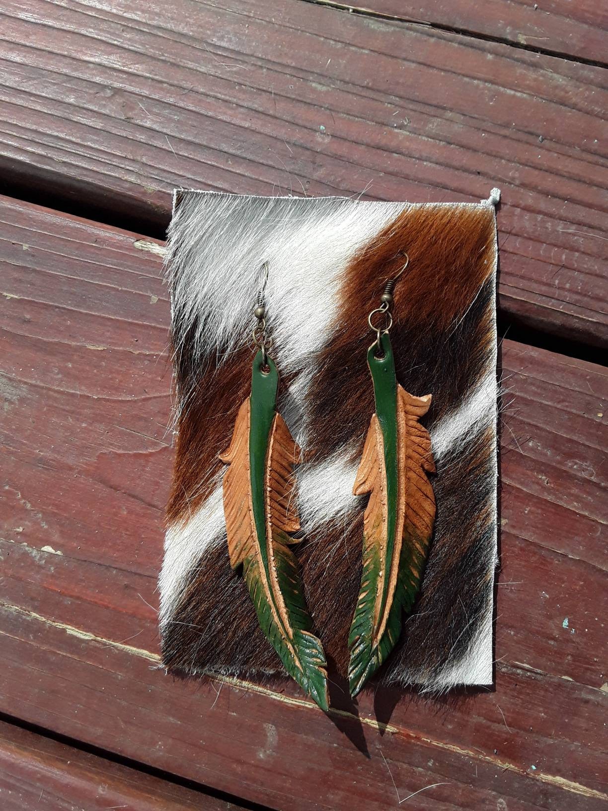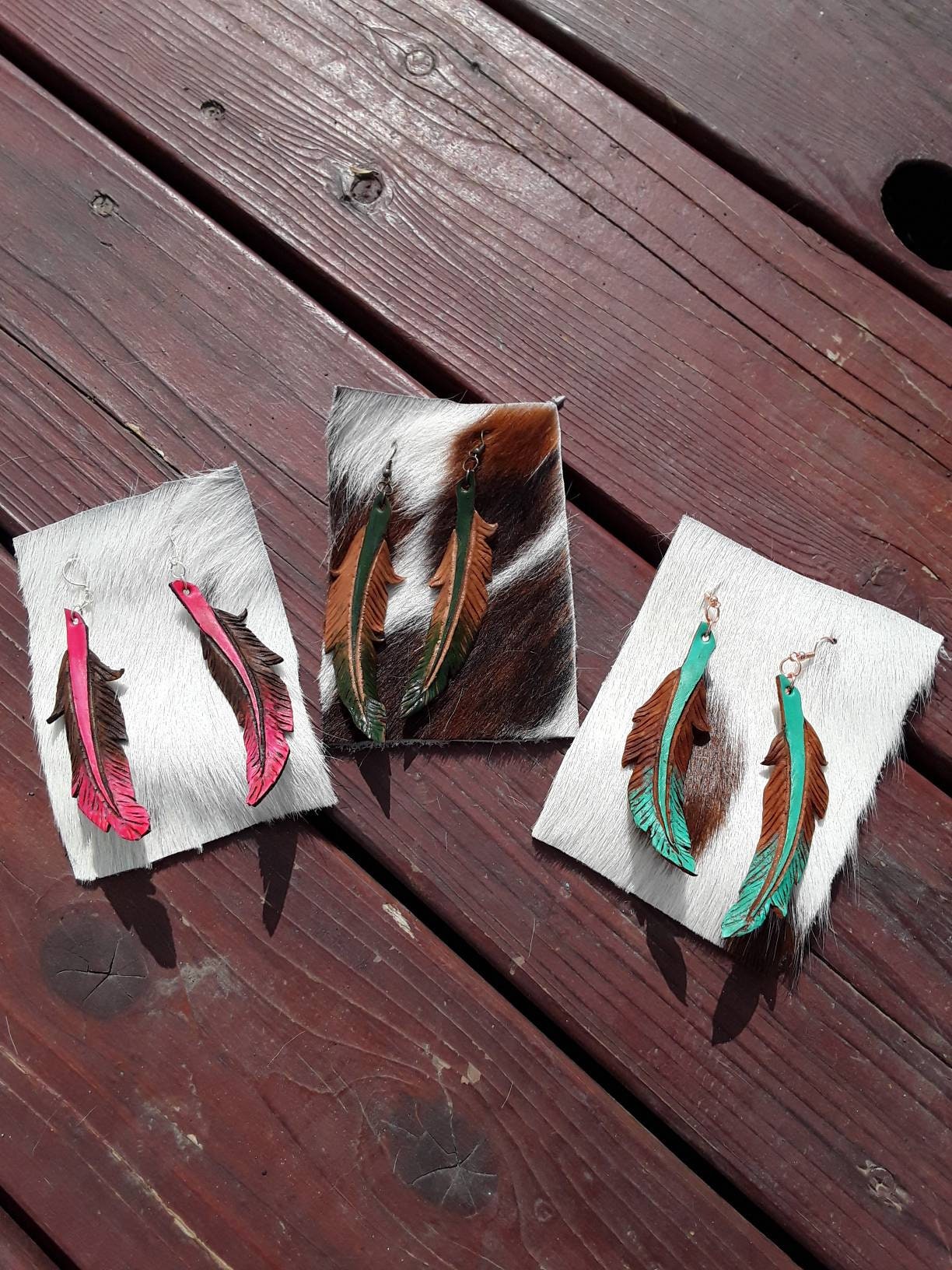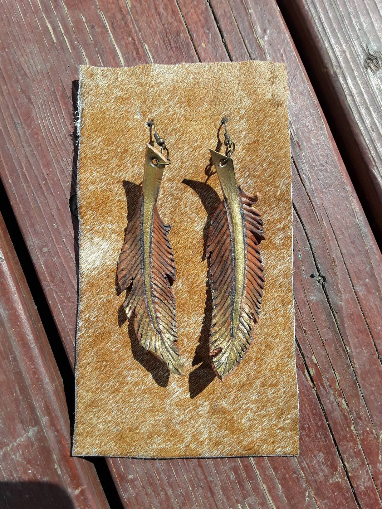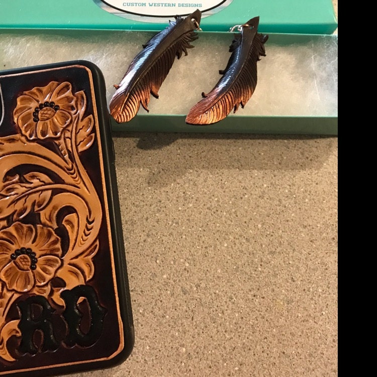 These earrings are customizable and no two alike! Each pair is handtooled and stained or painted to the finish of your choosing. The metal finishes can be copper, silver or antique brass. Message me to customize your pair!